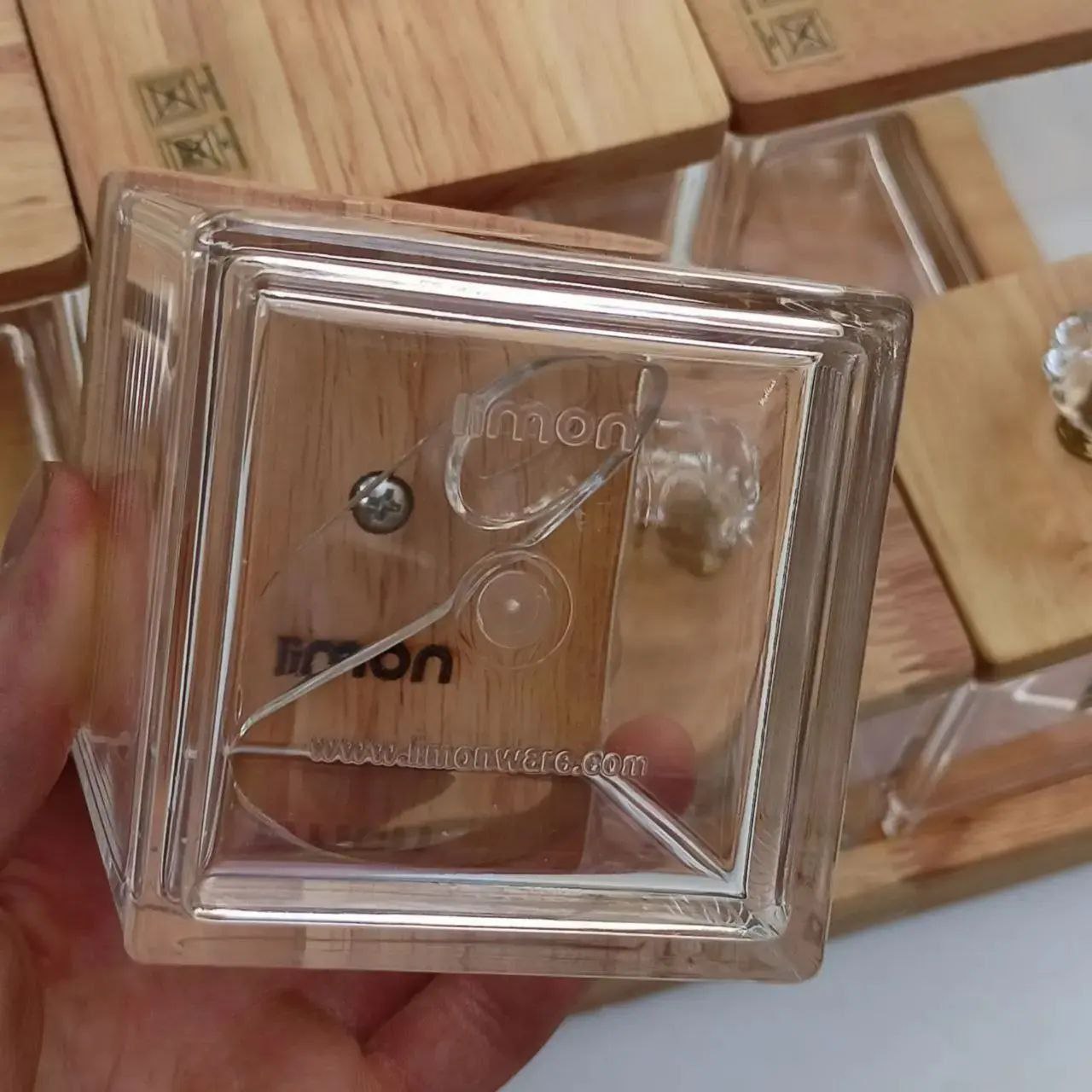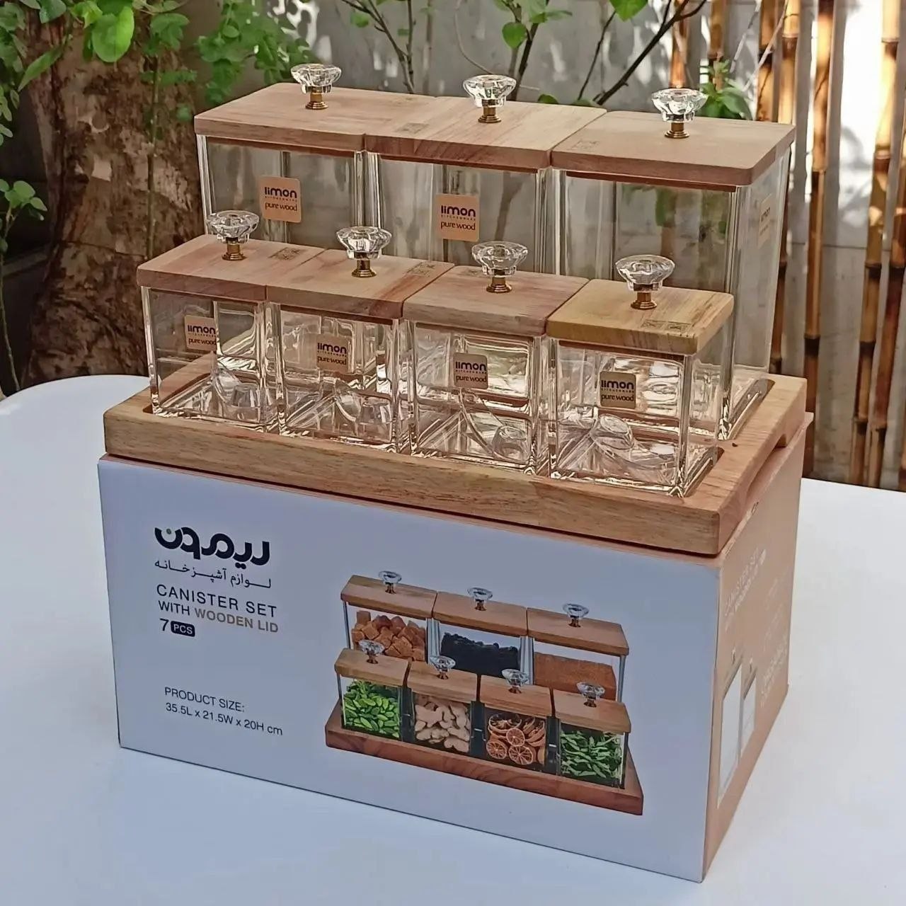 ست بانکه و ادویه ۷پارچه اکرولیک کفه دار درب چوبی برند لیمون طول: 35.5 سانتیمتر عرض: 21.5 سانتیمتر ارتفاع: ۲۰ سانت