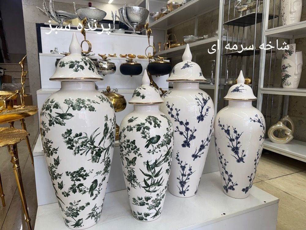 جینجر جار کنارسالنی ارتفاع ۵۵،۶۵ سانت پرنده سبز شاخه سرمه ای مشکی طلایی کار بسیار شیک و زیبا کیفیت عالی قیمت جفتی میباشد