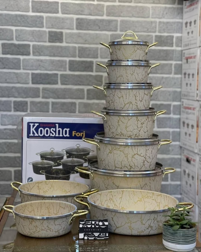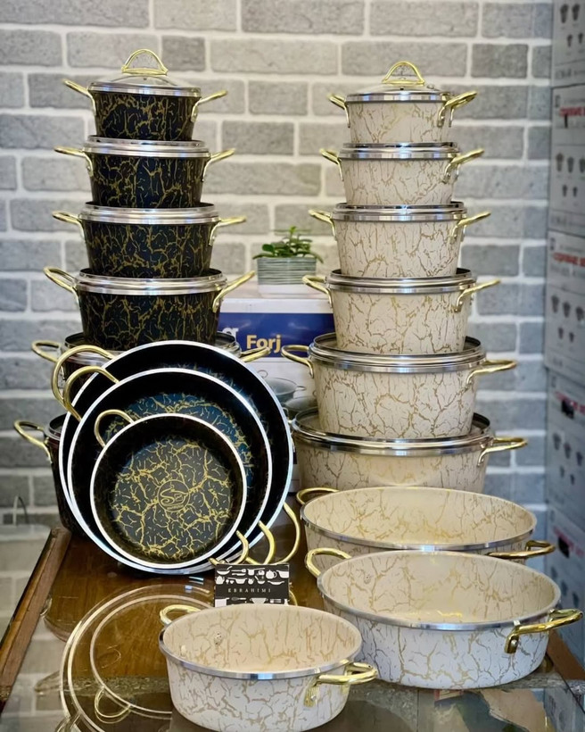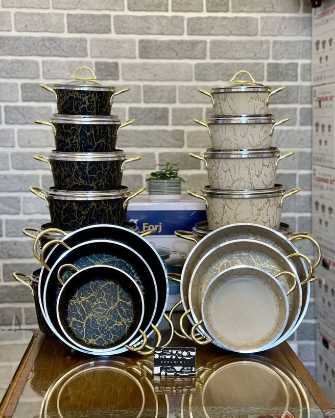 ✅دارای شش قابلمه به سایز های.۲۸.۲۴.۲۰.۱۸.۱۶.۱۴ وسه تابه به سایز ۲۸، ۲۴ ،۱۸